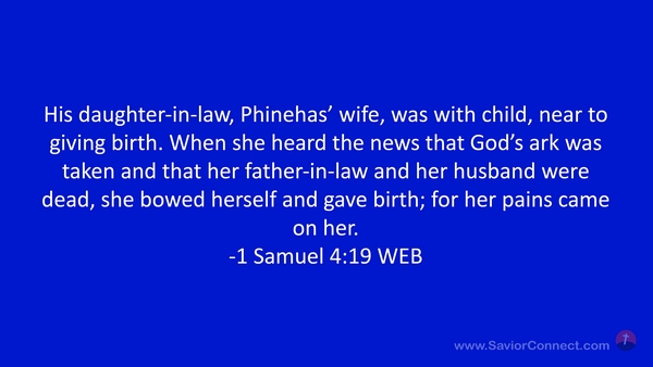 His daughter-in-law, Phinehas’ wife, was with child, near to giving birth. When she heard the news that God’s ark was taken and that her father-in-law and her husband were dead, she bowed herself and gave birth; for her pains came on her. -1 Samuel 4:19 WEB