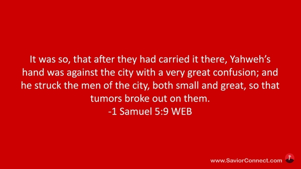 It was so, that after they had carried it there, Yahweh’s hand was against the city with a very great confusion; and he struck the men of the city, both small and great, so that tumors broke out on them. -1 Samuel 5:9 WEB