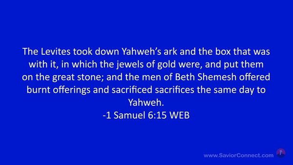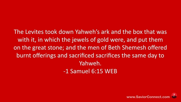 The Levites took down Yahweh’s ark and the box that was with it, in which the jewels of gold were, and put them on the great stone; and the men of Beth Shemesh offered burnt offerings and sacrificed sacrifices the same day to Yahweh. -1 Samuel 6:15 WEB