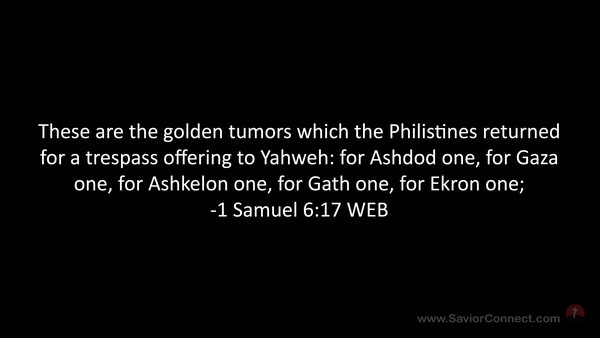 These are the golden tumors which the Philistines returned for a trespass offering to Yahweh: for Ashdod one, for Gaza one, for Ashkelon one, for Gath one, for Ekron one; -1 Samuel 6:17 WEB