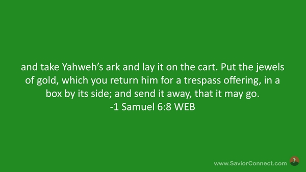 and take Yahweh’s ark and lay it on the cart. Put the jewels of gold, which you return him for a trespass offering, in a box by its side; and send it away, that it may go. -1 Samuel 6:8 WEB
