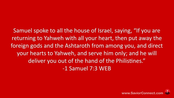 Samuel spoke to all the house of Israel, saying, “If you are returning to Yahweh with all your heart, then put away the foreign gods and the Ashtaroth from among you, and direct your hearts to Yahweh, and serve him only; and he will deliver you out of the hand of the Philistines.” -1 Samuel 7:3 WEB