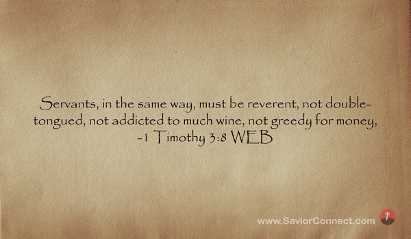Servants, in the same way, must be reverent, not double-tongued, not addicted to much wine, not greedy for money, -1 Timothy 3:8 WEB