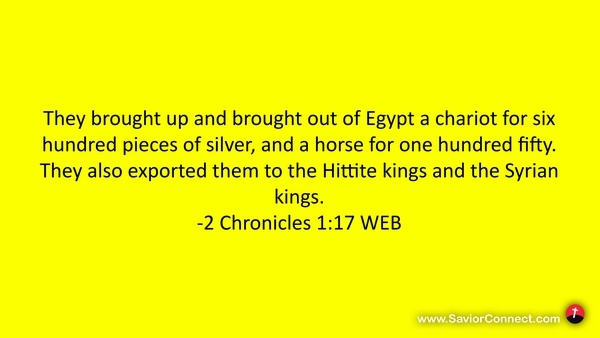 They brought up and brought out of Egypt a chariot for six hundred pieces of silver, and a horse for one hundred fifty. They also exported them to the Hittite kings and the Syrian kings. -2 Chronicles 1:17 WEB