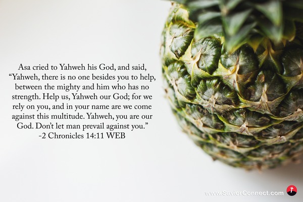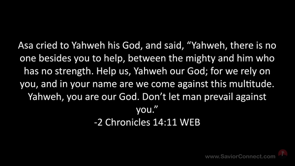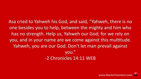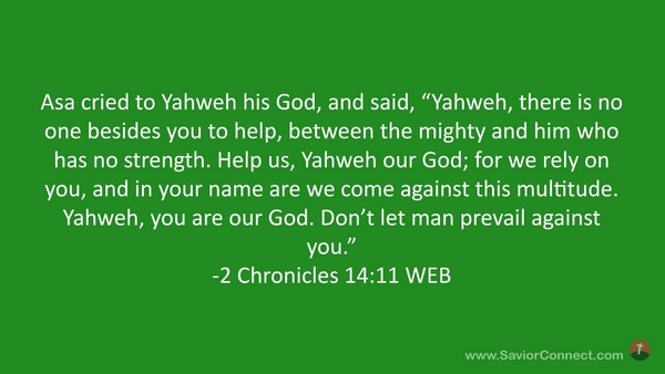 Asa cried to Yahweh his God, and said, “Yahweh, there is no one besides you to help, between the mighty and him who has no strength. Help us, Yahweh our God; for we rely on you, and in your name are we come against this multitude. Yahweh, you are our God. Don’t let man prevail against you.” -2 Chronicles 14:11 WEB