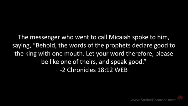 The messenger who went to call Micaiah spoke to him, saying, “Behold, the words of the prophets declare good to the king with one mouth. Let your word therefore, please be like one of theirs, and speak good.” -2 Chronicles 18:12 WEB