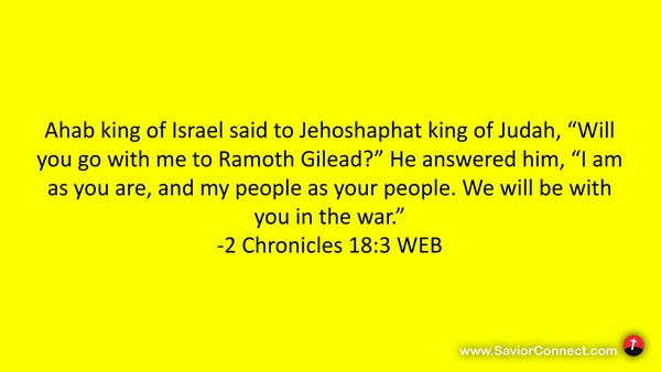 Ahab king of Israel said to Jehoshaphat king of Judah, “Will you go with me to Ramoth Gilead?” He answered him, “I am as you are, and my people as your people. We will be with you in the war.” -2 Chronicles 18:3 WEB