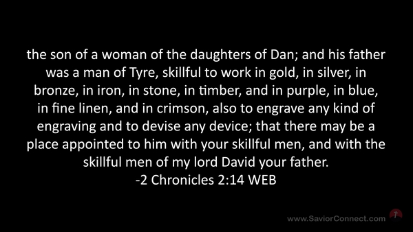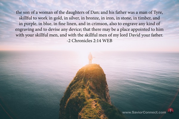 the son of a woman of the daughters of Dan; and his father was a man of Tyre, skillful to work in gold, in silver, in bronze, in iron, in stone, in timber, and in purple, in blue, in fine linen, and in crimson, also to engrave any kind of engraving and to devise any device; that there may be a place appointed to him with your skillful men, and with the skillful men of my lord David your father. -2 Chronicles 2:14 WEB