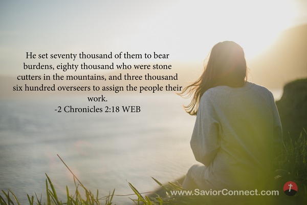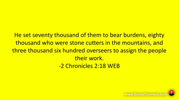 He set seventy thousand of them to bear burdens, eighty thousand who were stone cutters in the mountains, and three thousand six hundred overseers to assign the people their work. -2 Chronicles 2:18 WEB