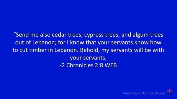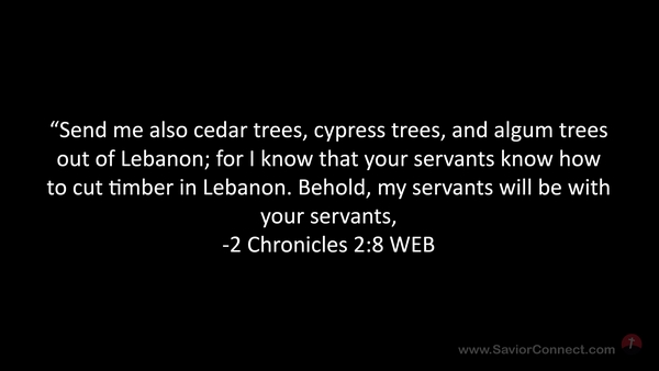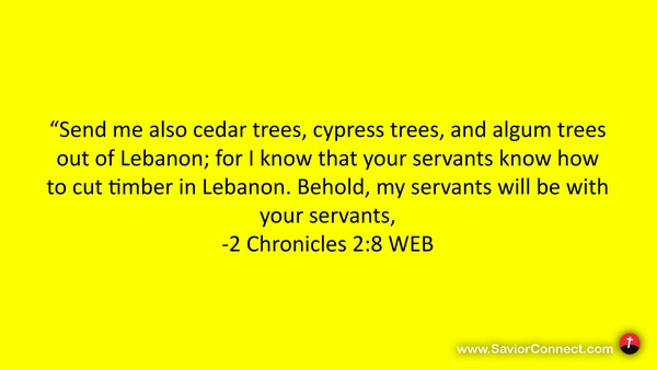 “Send me also cedar trees, cypress trees, and algum trees out of Lebanon; for I know that your servants know how to cut timber in Lebanon. Behold, my servants will be with your servants, -2 Chronicles 2:8 WEB