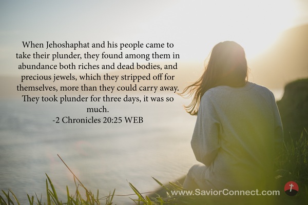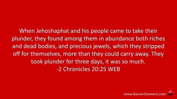 When Jehoshaphat and his people came to take their plunder, they found among them in abundance both riches and dead bodies, and precious jewels, which they stripped off for themselves, more than they could carry away. They took plunder for three days, it was so much. -2 Chronicles 20:25 WEB