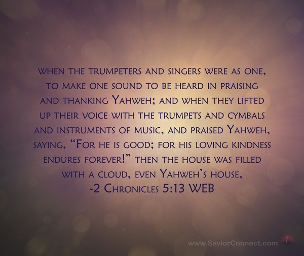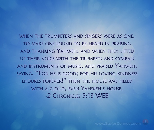 when the trumpeters and singers were as one, to make one sound to be heard in praising and thanking Yahweh; and when they lifted up their voice with the trumpets and cymbals and instruments of music, and praised Yahweh, saying, “For he is good; for his loving kindness endures forever!” then the house was filled with a cloud, even Yahweh’s house, -2 Chronicles 5:13 WEB