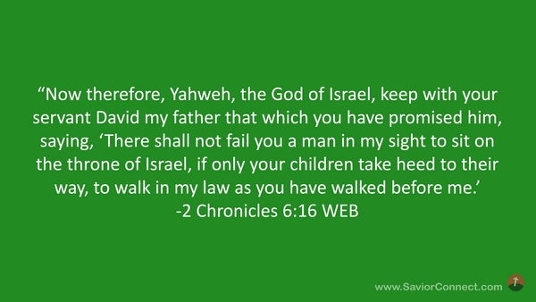 “Now therefore, Yahweh, the God of Israel, keep with your servant David my father that which you have promised him, saying, 'There shall not fail you a man in my sight to sit on the throne of Israel, if only your children take heed to their way, to walk in my law as you have walked before me.’ -2 Chronicles 6:16 WEB