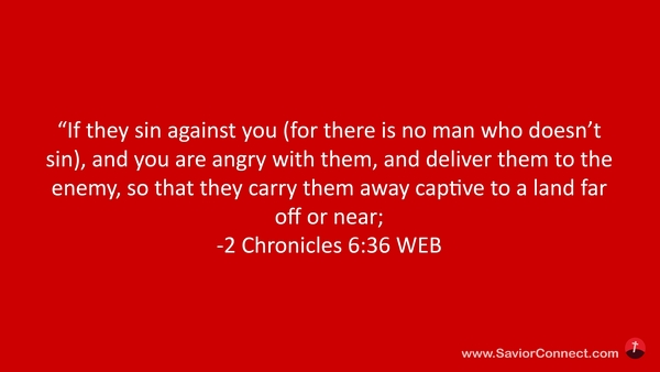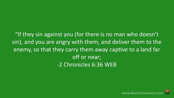 “If they sin against you (for there is no man who doesn’t sin), and you are angry with them, and deliver them to the enemy, so that they carry them away captive to a land far off or near; -2 Chronicles 6:36 WEB