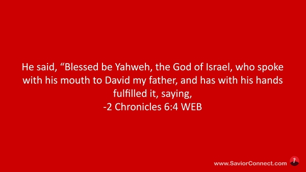 He said, “Blessed be Yahweh, the God of Israel, who spoke with his mouth to David my father, and has with his hands fulfilled it, saying, -2 Chronicles 6:4 WEB
