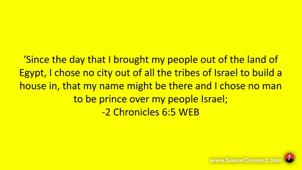 'Since the day that I brought my people out of the land of Egypt, I chose no city out of all the tribes of Israel to build a house in, that my name might be there and I chose no man to be prince over my people Israel; -2 Chronicles 6:5 WEB