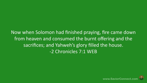 Now when Solomon had finished praying, fire came down from heaven and consumed the burnt offering and the sacrifices; and Yahweh’s glory filled the house. -2 Chronicles 7:1 WEB