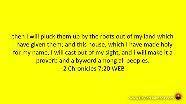 then I will pluck them up by the roots out of my land which I have given them; and this house, which I have made holy for my name, I will cast out of my sight, and I will make it a proverb and a byword among all peoples. -2 Chronicles 7:20 WEB