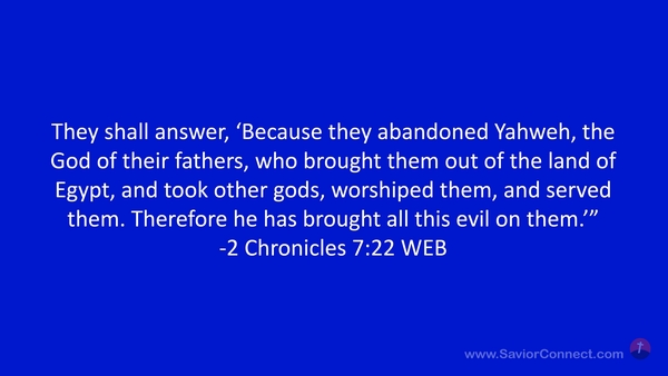 They shall answer, 'Because they abandoned Yahweh, the God of their fathers, who brought them out of the land of Egypt, and took other gods, worshiped them, and served them. Therefore he has brought all this evil on them.’” -2 Chronicles 7:22 WEB
