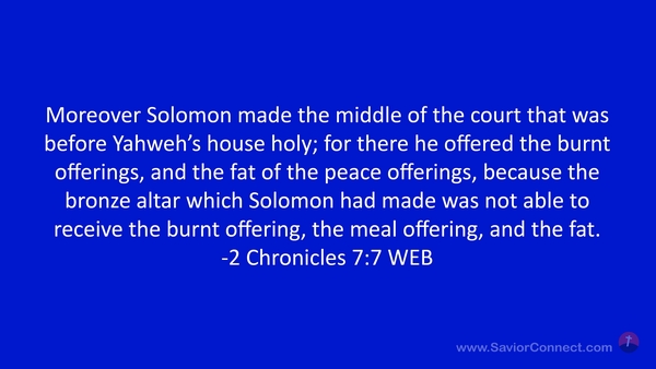 Moreover Solomon made the middle of the court that was before Yahweh’s house holy; for there he offered the burnt offerings, and the fat of the peace offerings, because the bronze altar which Solomon had made was not able to receive the burnt offering, the meal offering, and the fat. -2 Chronicles 7:7 WEB