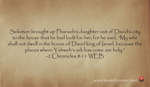 Solomon brought up Pharaoh’s daughter out of David’s city to the house that he had built for her; for he said, “My wife shall not dwell in the house of David king of Israel, because the places where Yahweh’s ark has come are holy.” -2 Chronicles 8:11 WEB