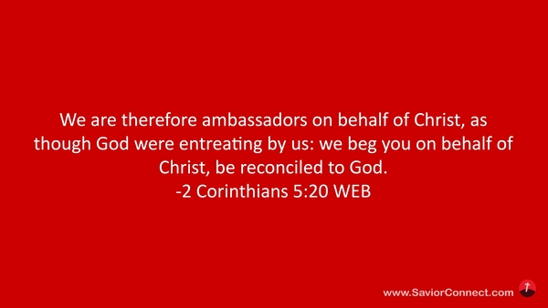 We are therefore ambassadors on behalf of Christ, as though God were entreating by us: we beg you on behalf of Christ, be reconciled to God. -2 Corinthians 5:20 WEB
