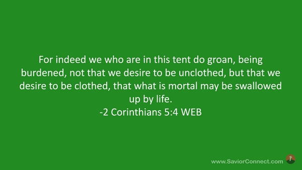 For indeed we who are in this tent do groan, being burdened, not that we desire to be unclothed, but that we desire to be clothed, that what is mortal may be swallowed up by life. -2 Corinthians 5:4 WEB