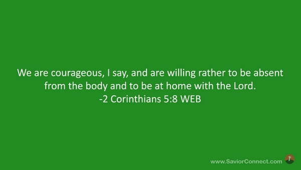 We are courageous, I say, and are willing rather to be absent from the body and to be at home with the Lord. -2 Corinthians 5:8 WEB