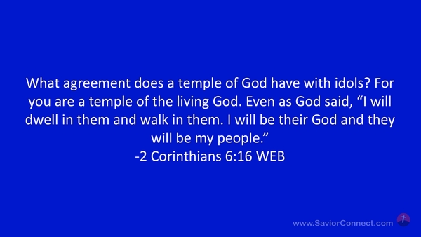 What agreement does a temple of God have with idols? For you are a temple of the living God. Even as God said, “I will dwell in them and walk in them. I will be their God and they will be my people.” -2 Corinthians 6:16 WEB