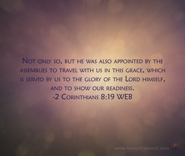 Not only so, but he was also appointed by the assemblies to travel with us in this grace, which is served by us to the glory of the Lord himself, and to show our readiness. -2 Corinthians 8:19 WEB