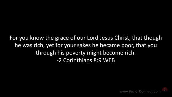 For you know the grace of our Lord Jesus Christ, that though he was rich, yet for your sakes he became poor, that you through his poverty might become rich. -2 Corinthians 8:9 WEB