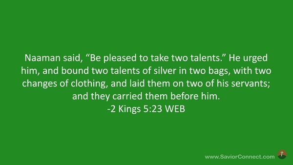Naaman said, “Be pleased to take two talents.” He urged him, and bound two talents of silver in two bags, with two changes of clothing, and laid them on two of his servants; and they carried them before him. -2 Kings 5:23 WEB