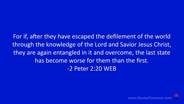 For if, after they have escaped the defilement of the world through the knowledge of the Lord and Savior Jesus Christ, they are again entangled in it and overcome, the last state has become worse for them than the first. -2 Peter 2:20 WEB