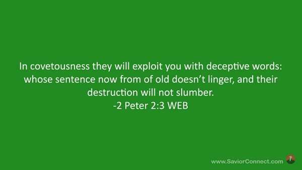 In covetousness they will exploit you with deceptive words: whose sentence now from of old doesn’t linger, and their destruction will not slumber. -2 Peter 2:3 WEB