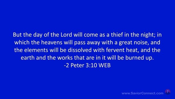 But the day of the Lord will come as a thief in the night; in which the heavens will pass away with a great noise, and the elements will be dissolved with fervent heat, and the earth and the works that are in it will be burned up. -2 Peter 3:10 WEB