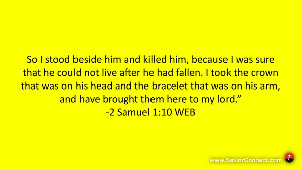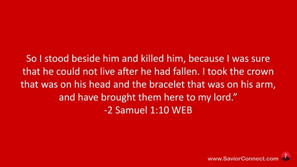 So I stood beside him and killed him, because I was sure that he could not live after he had fallen. I took the crown that was on his head and the bracelet that was on his arm, and have brought them here to my lord.” -2 Samuel 1:10 WEB