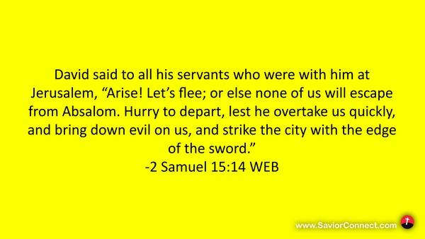 David said to all his servants who were with him at Jerusalem, “Arise! Let’s flee; or else none of us will escape from Absalom. Hurry to depart, lest he overtake us quickly, and bring down evil on us, and strike the city with the edge of the sword.” -2 Samuel 15:14 WEB