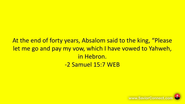 At the end of forty years, Absalom said to the king, “Please let me go and pay my vow, which I have vowed to Yahweh, in Hebron. -2 Samuel 15:7 WEB