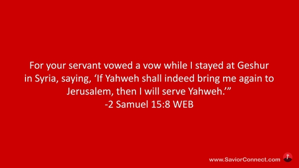 For your servant vowed a vow while I stayed at Geshur in Syria, saying, 'If Yahweh shall indeed bring me again to Jerusalem, then I will serve Yahweh.’” -2 Samuel 15:8 WEB
