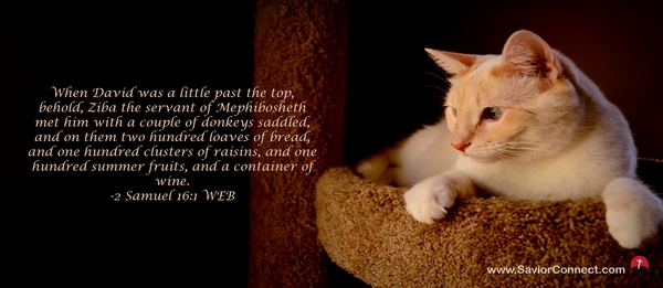 When David was a little past the top, behold, Ziba the servant of Mephibosheth met him with a couple of donkeys saddled, and on them two hundred loaves of bread, and one hundred clusters of raisins, and one hundred summer fruits, and a container of wine. -2 Samuel 16:1 WEB