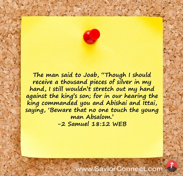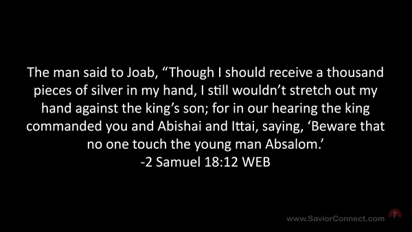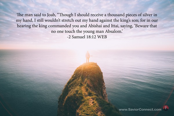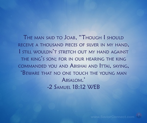 The man said to Joab, “Though I should receive a thousand pieces of silver in my hand, I still wouldn’t stretch out my hand against the king’s son; for in our hearing the king commanded you and Abishai and Ittai, saying, 'Beware that no one touch the young man Absalom.’ -2 Samuel 18:12 WEB