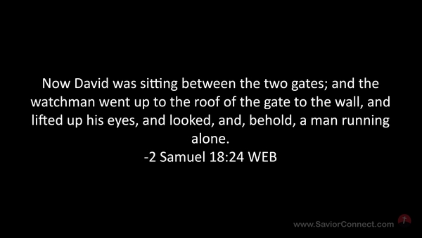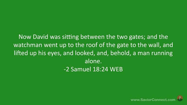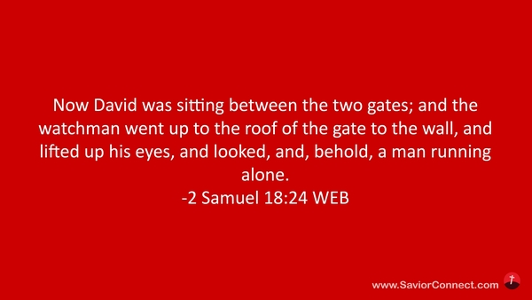 Now David was sitting between the two gates; and the watchman went up to the roof of the gate to the wall, and lifted up his eyes, and looked, and, behold, a man running alone. -2 Samuel 18:24 WEB
