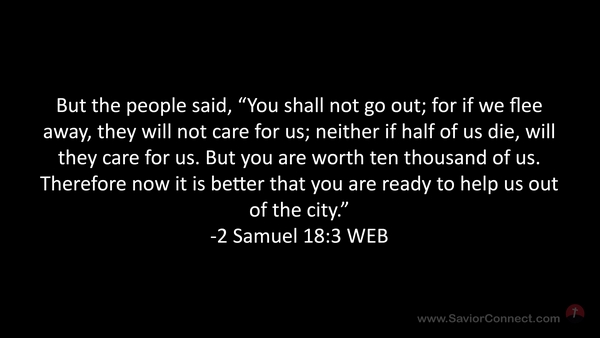 But the people said, “You shall not go out; for if we flee away, they will not care for us; neither if half of us die, will they care for us. But you are worth ten thousand of us. Therefore now it is better that you are ready to help us out of the city.” -2 Samuel 18:3 WEB
