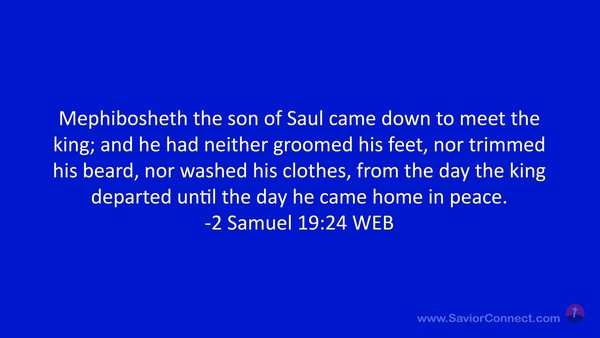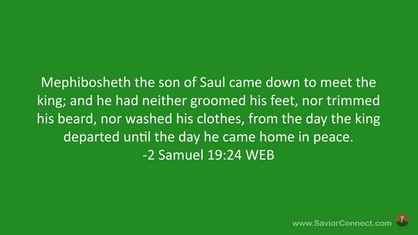 Mephibosheth the son of Saul came down to meet the king; and he had neither groomed his feet, nor trimmed his beard, nor washed his clothes, from the day the king departed until the day he came home in peace. -2 Samuel 19:24 WEB
