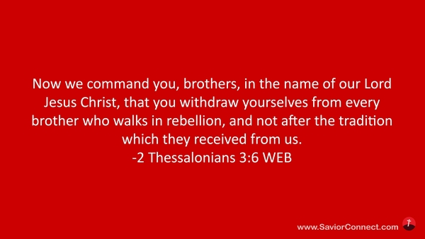 Now we command you, brothers, in the name of our Lord Jesus Christ, that you withdraw yourselves from every brother who walks in rebellion, and not after the tradition which they received from us. -2 Thessalonians 3:6 WEB