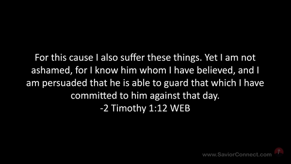 For this cause I also suffer these things. Yet I am not ashamed, for I know him whom I have believed, and I am persuaded that he is able to guard that which I have committed to him against that day. -2 Timothy 1:12 WEB