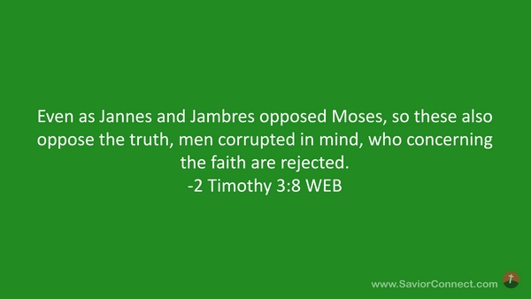 Even as Jannes and Jambres opposed Moses, so these also oppose the truth, men corrupted in mind, who concerning the faith are rejected. -2 Timothy 3:8 WEB