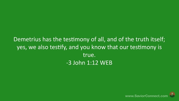 Demetrius has the testimony of all, and of the truth itself; yes, we also testify, and you know that our testimony is true. -3 John 1:12 WEB