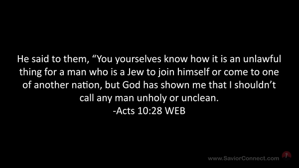 He said to them, “You yourselves know how it is an unlawful thing for a man who is a Jew to join himself or come to one of another nation, but God has shown me that I shouldn’t call any man unholy or unclean. -Acts 10:28 WEB