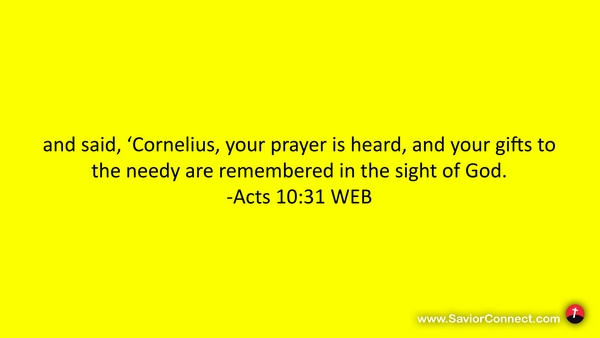 and said, 'Cornelius, your prayer is heard, and your gifts to the needy are remembered in the sight of God. -Acts 10:31 WEB
